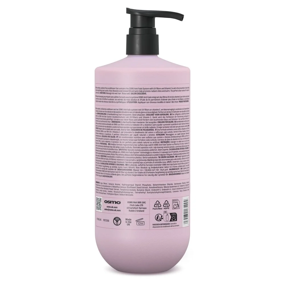 Un acondicionador nutritivo 100 % libre de sal y sulfato que contiene el sistema OSMO® Anti-Fade con filtros UV y vitamina E para ayudar a prevenir la decoloración del color mientras fortalece la cutícula. Los extractos de aceite de linaza y absoluto de rosa ayudan a promover un brillo y un brillo radiantes. El salvador de color perfecto para cabello natural o sintético. También disponible en 1000ml. Completamente libre de crueldad.