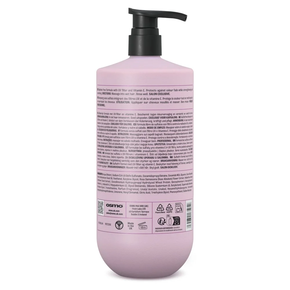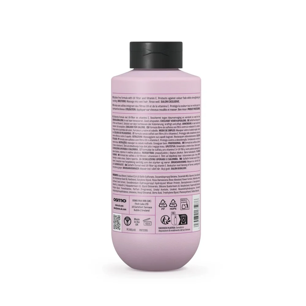 Champú 100% libre de sal y sulfatos. La fórmula humectante suave contiene el sistema OSMO® Anti-Fade con filtro UV y vitamina E para ayudar a prevenir la decoloración del color mientras fortalece cada cutícula. Los extractos de aceite de linaza y absoluto de rosa ayudan a promover un brillo radiante y lustroso. Completamente libre de crueldad.